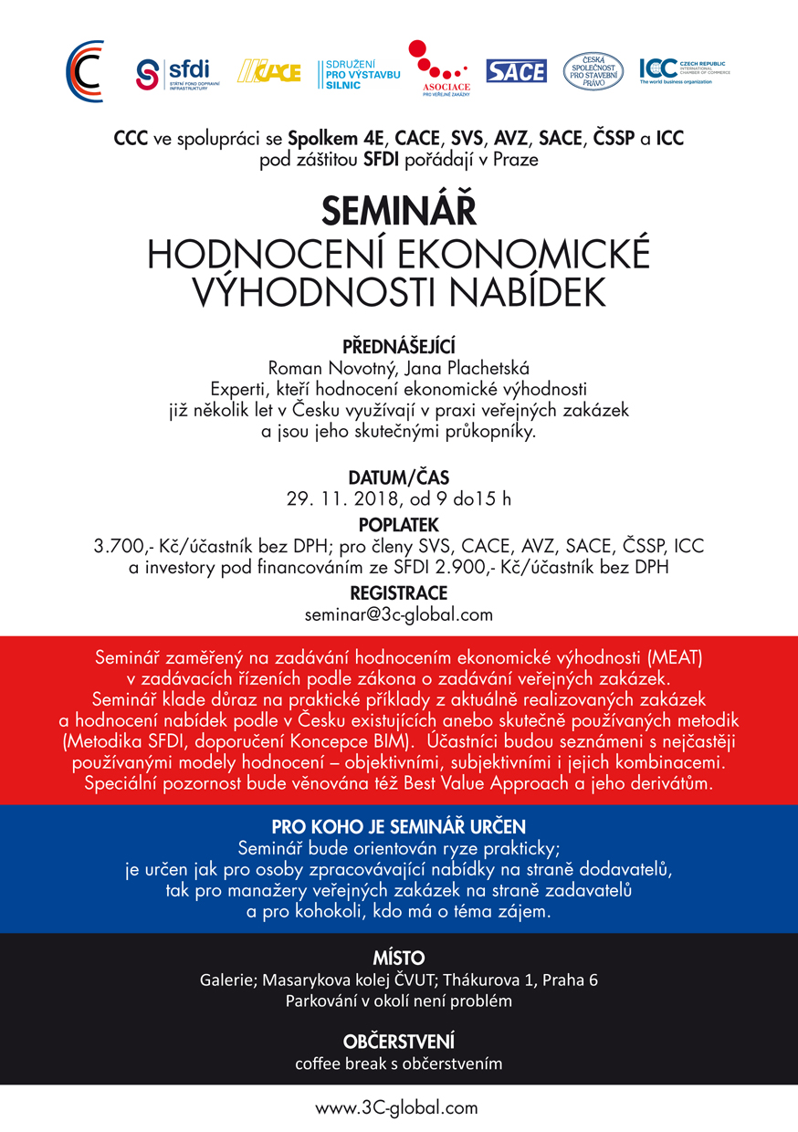 Seminář zaměřený na zadávání hodnocením ekonomické výhodnosti (MEAT) v zadávacích řízeních podle zákona o zadávání veřejných zakázek. Seminář klade důraz na praktické příklady z aktuálně realizovaných zakázek a hodnocení nabídek podle v Česku existujících anebo skutečně používaných metodik (Metodika SFDI, doporučení Koncepce BIM).