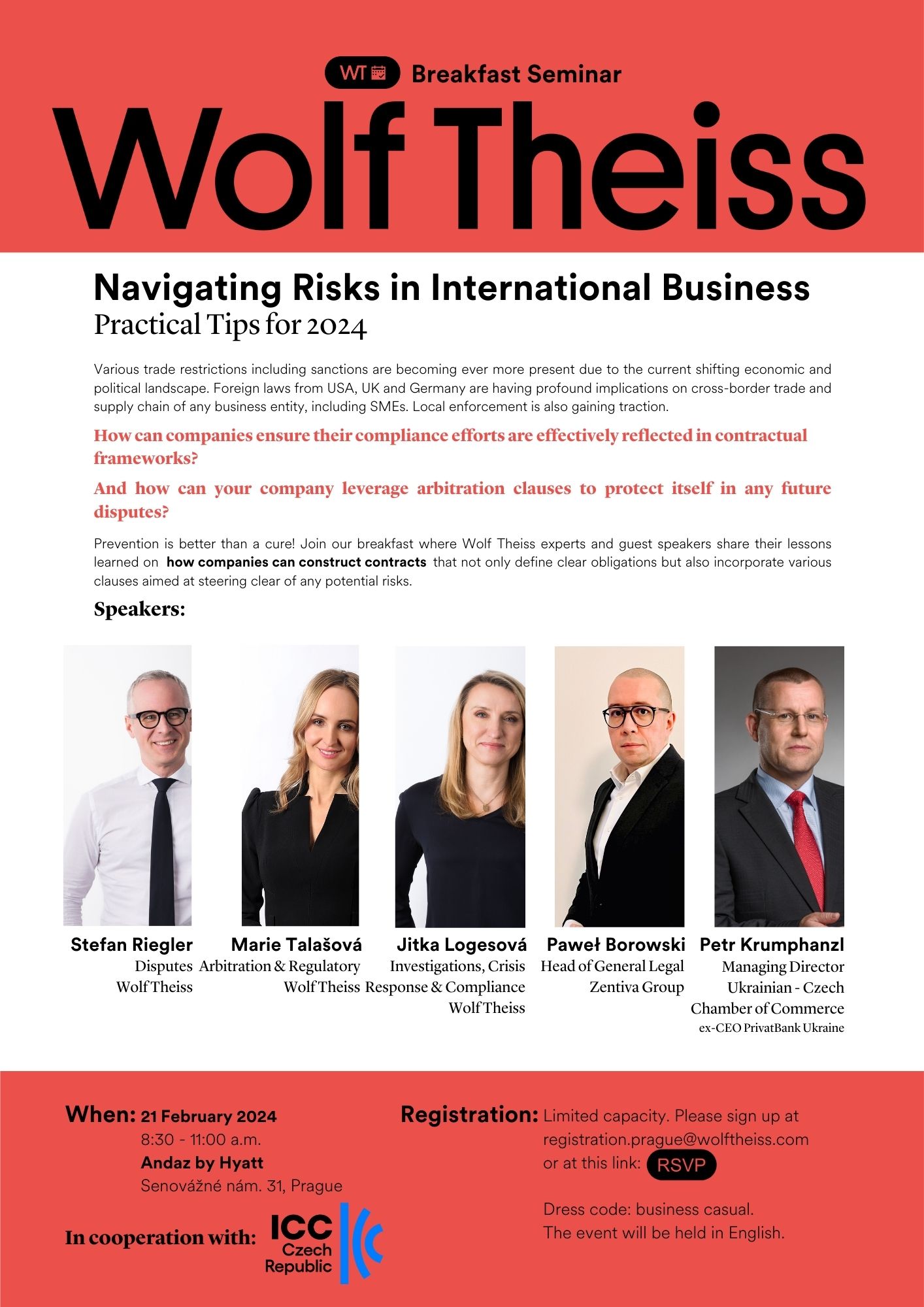 Prevention is better than a cure! Join our breakfast where Wolf Theiss experts and guest speakers share their lessons learned on how companies can construct contracts that not only define clear obligations but also incorporate various clauses aimed at steering clear of any potential risks.